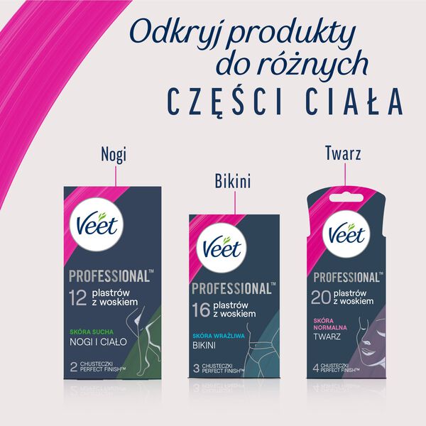 WYPRÓBUJ VEET Professional PLASTRY DO DEPILACJI SKÓRA SUCHA, CIAŁO I NOGI, KTÓRE ZAPEWNIĄ CI AŻ DO 28 DNI GŁADKOŚCI.
